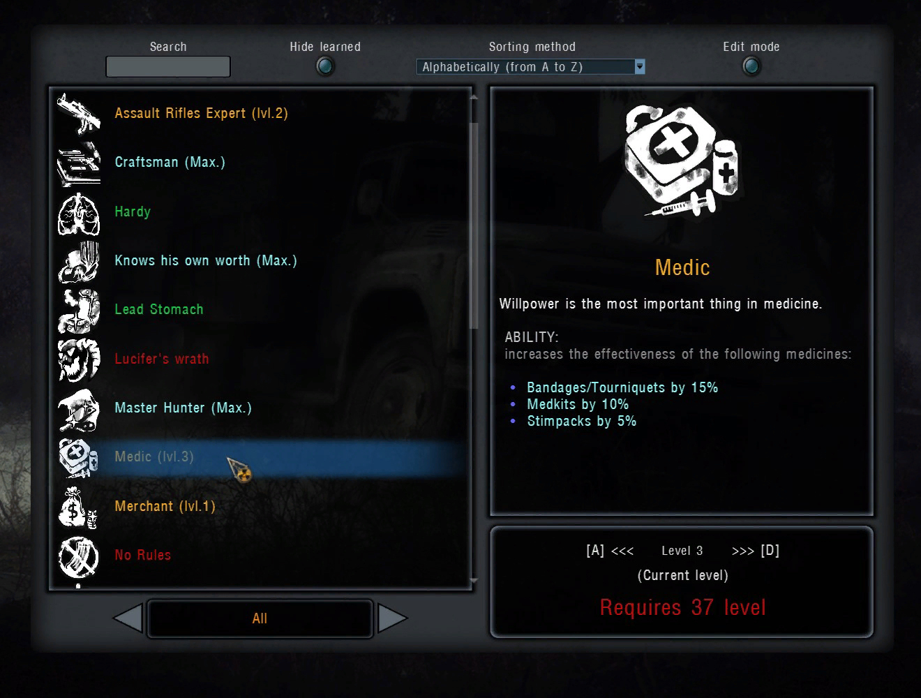 При накоплении опыта персонаж повышает уровень и получает очки для изучения навыков.