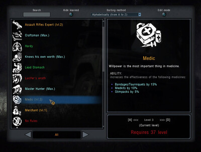 Мод реализует систему получения опыта из различных источников, повышение уровня персонажа и распределение очков навыков.